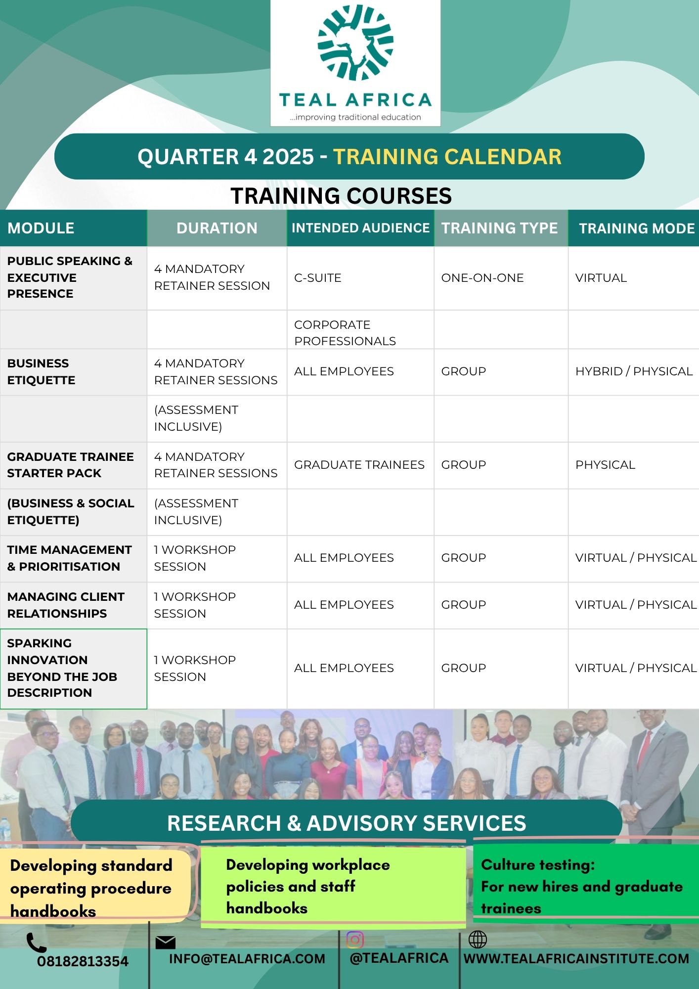 Our training portfolio covers a variety of competency areas, including business etiquette, organizational efficiency, customer service, and public speaking. It is designed to meet the needs of employees at all levels within an organization.